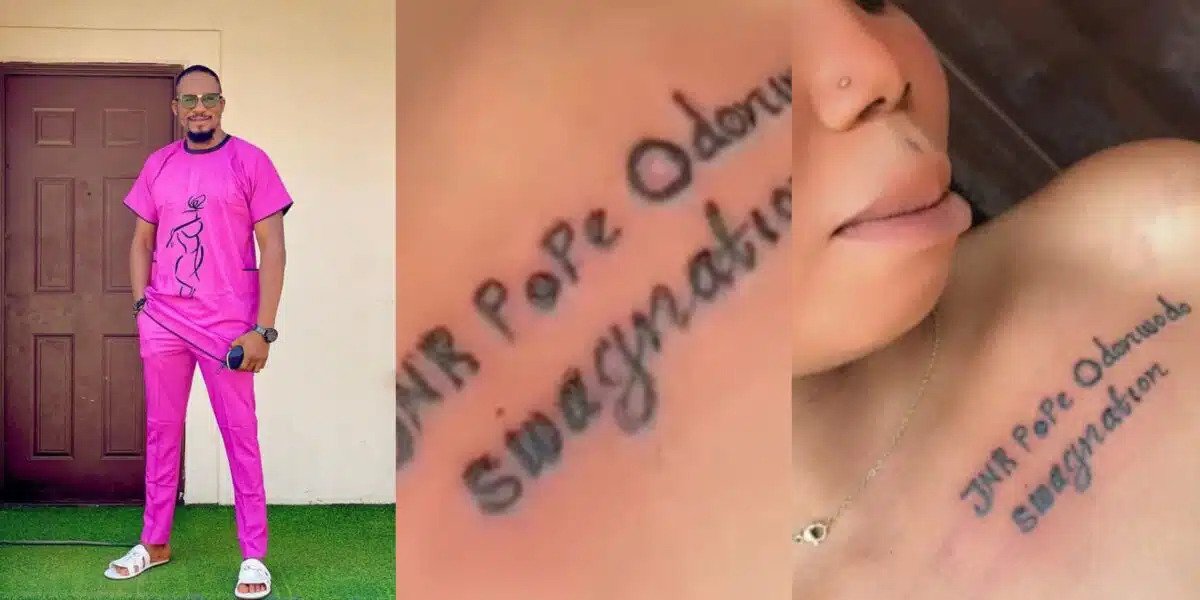 Junior Pope, a Nollywood actor, has expressed delight after a female admirer tattooed his complete name on her breast.
