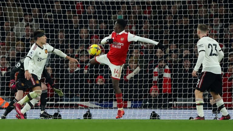 Eddie Nketiah’s last-minute goal saw Arsenal beat Manchester United 3-2 in a thrilling contest at the Emirates as the league leaders restored their five-point advantage over Manchester City.