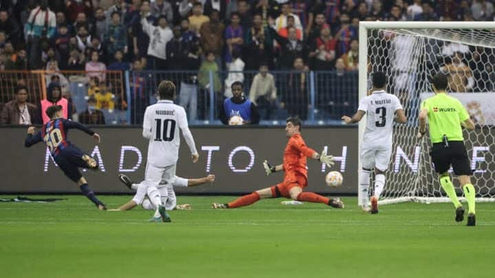 Madrid goalkeeper Thibaut Courtois, who was outstanding in his team’s semi-final victory over Valencia on Wednesday, made a brilliant early save to deny Lewandowski, tipping his low drive against the post and out.