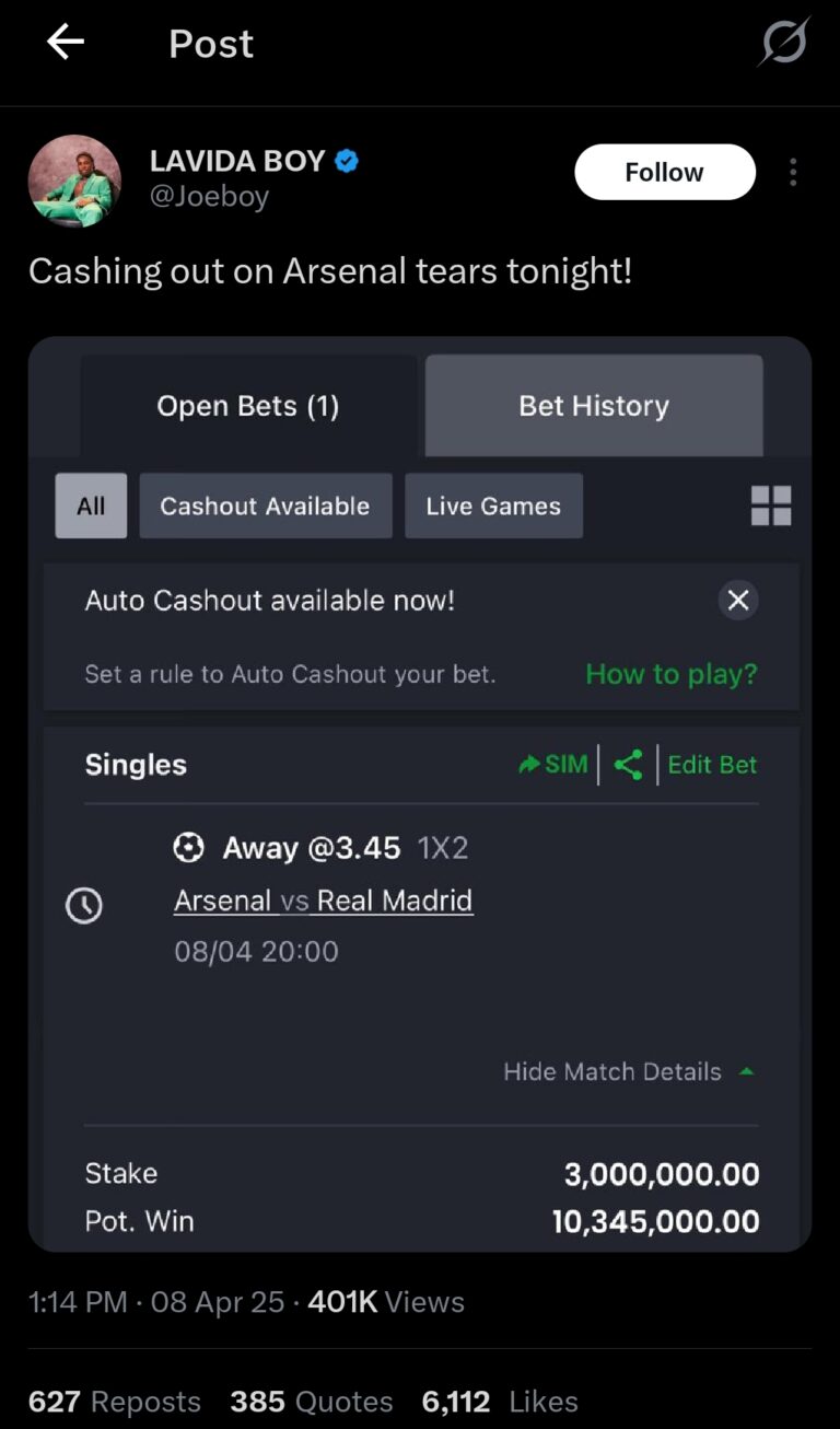 Nigerian artist Joeboy has confidently bet ₦3 million on Real Madrid defeating Arsenal in the upcoming UCL quarter-final clash.