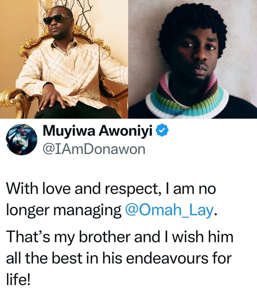 In a heartfelt announcement that has stirred conversation across social media, Muyiwa Awoniyi, the longtime manager of Nigerian Afrobeats star Omah Lay, has officially ended his professional relationship with the singer.