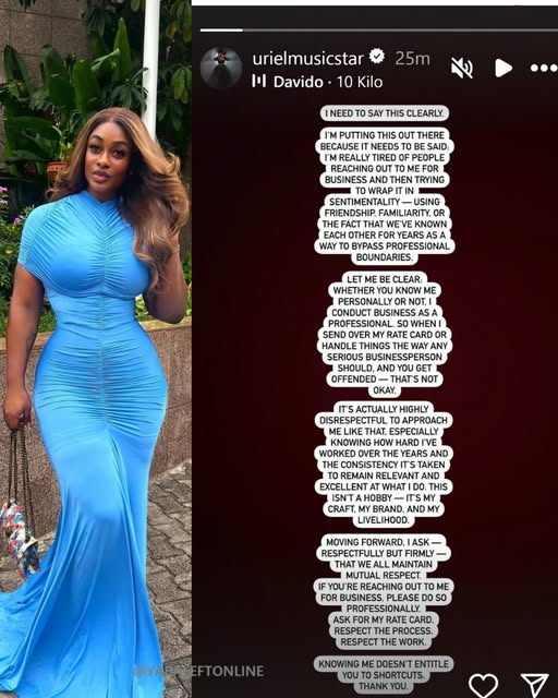 Reality TV star and entrepreneur Uriel Oputa has taken to her Instagram Stories to issue a firm statement to those attempting to mix personal familiarity with professional requests.